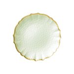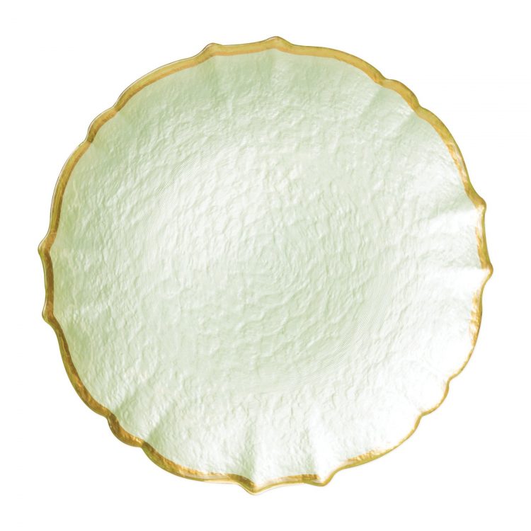 Our Baroque Glass Charger brings a hint of sparkle to your event. Available in Pistachio green with a gold rim. Also available in salad plate size.